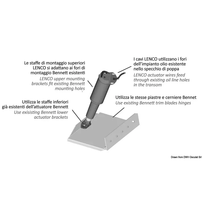 This kit includes:- 2 electrical actuators- 2 upper brakets (some bores as Bennet)-2 connectors for connection to Bennet wiring- screws included.This kit can replace a Bennet kit thus avoiding the hydraulic central unit. It uses the existing Bennet flaps, wiring and panel.