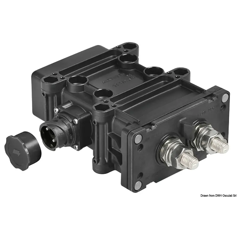 Bistable/magnetic current switch, it absorbs current only when switched from (OFF) to (ON) and vice versa via a remote switch.Additional outlet to connect a warning light or an audible alarm. M10 nickel-plated brass terminal hardware. Silver-plated copper terminals.