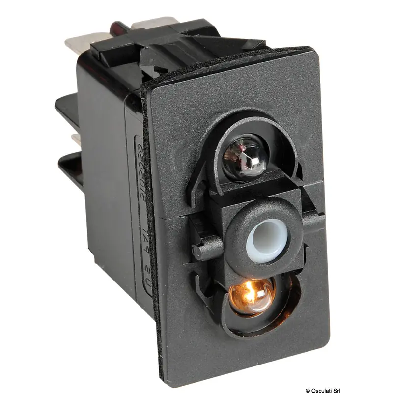 IP56 watertight, Marina series. 21.5x36.8-mm rectangular bore required for installation. Maximum capacity 20 A at 12 V and 15 A at 24 V. Supplied with double red LED: one for the symbol, which is always on, the second for a special slit under the symbol that switches on when thesymbol indicator is activated. Rocker switch to order separately.