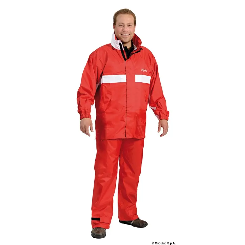 Made of breathable nylon, 100% waterproof and with polyurethane, 100% windproof. All taped seams.Jacket: rustproof zip + velcro fastened protection flap, 2 x water-resistant pockets, waterproof and adjustable foldaway hood.High trousers: adjustable shoulder straps with quick fastening, ankle adjustment, elastic waist.
