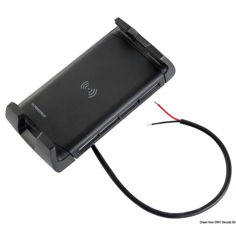 High-performance wireless cell phone charger for marine purposes. It fits cell phones 120- (4.7") to 173-mm (6.8") long.- 100% IPX6 watertight.- High degree grip.- Anodized aluminium case.- It can be plugged with a single hand.- Installation on any flat surface.- LED charge indicator.