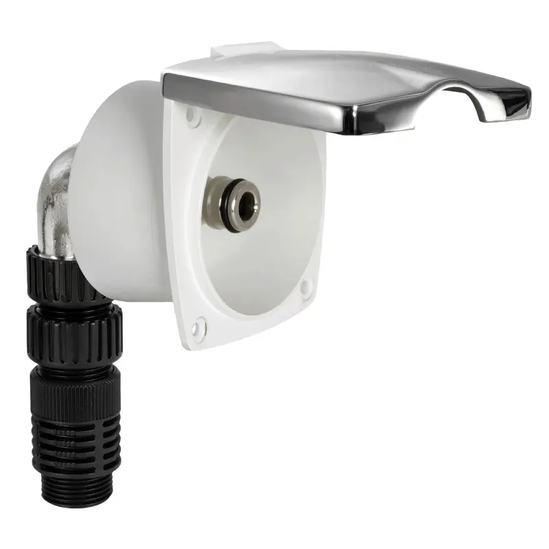 This reducer is designed for the introduction of water from the dock to the onboard system. The connection to the dock water pipe is made via a snap fitting of the gardening type (see code 36.189.02), while the output is equipped with a 3/4" male thread. Pressure reducers with a plastic element, like this one, do not reduce pressure but limit flow rate. This allows water to enter the system gradually, avoiding stress on the piping. If the system remains connected to the dock, the pressure automatically aligns with that of land.