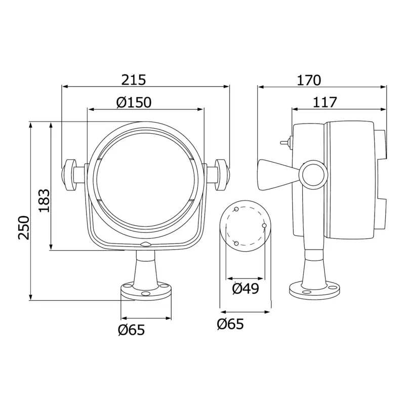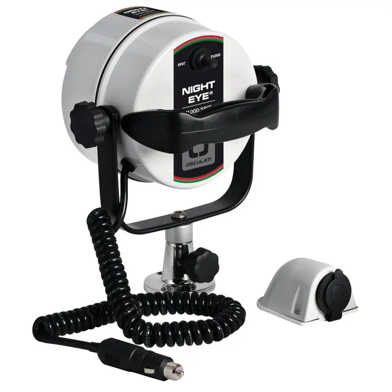 Features:- ABS with anodized aluminium bracket and stainless steel base.- WAGNER optical bulb.- Full 360° rotation and elevation joint, frictioning.- Detachable light with 2-m extention cable.- Special watertight switch, fitted with rubber cover, integrated into the rear dome.- Equipped with watertight plug for recess or flat mounting.Features:- Weather resistant.- Vacuum-sealed optic bulb, humidity- and salt-resistant.- Great power.- Light weight, low cost.