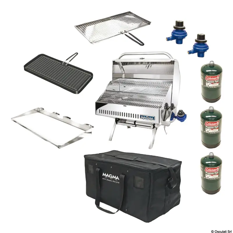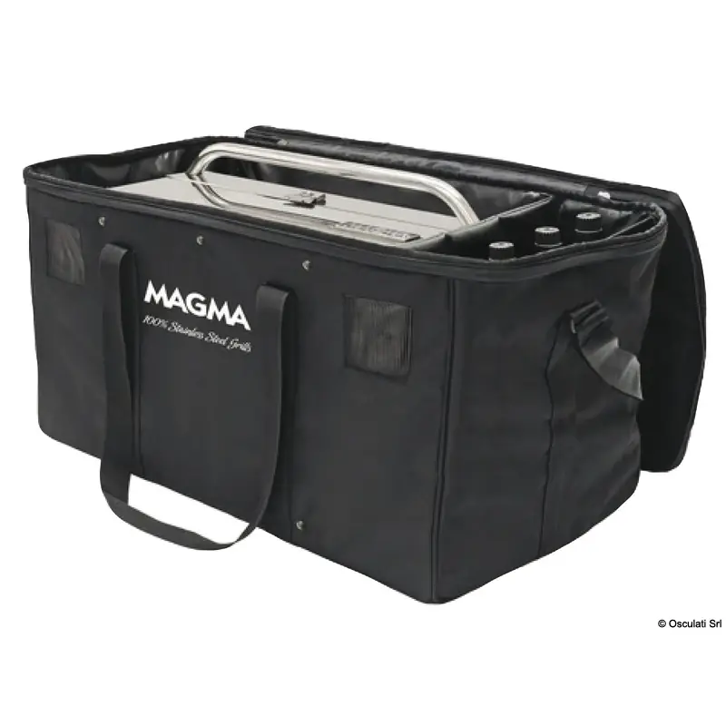 Durable padded bag for secure storage and transport of Magma grills and accessories.