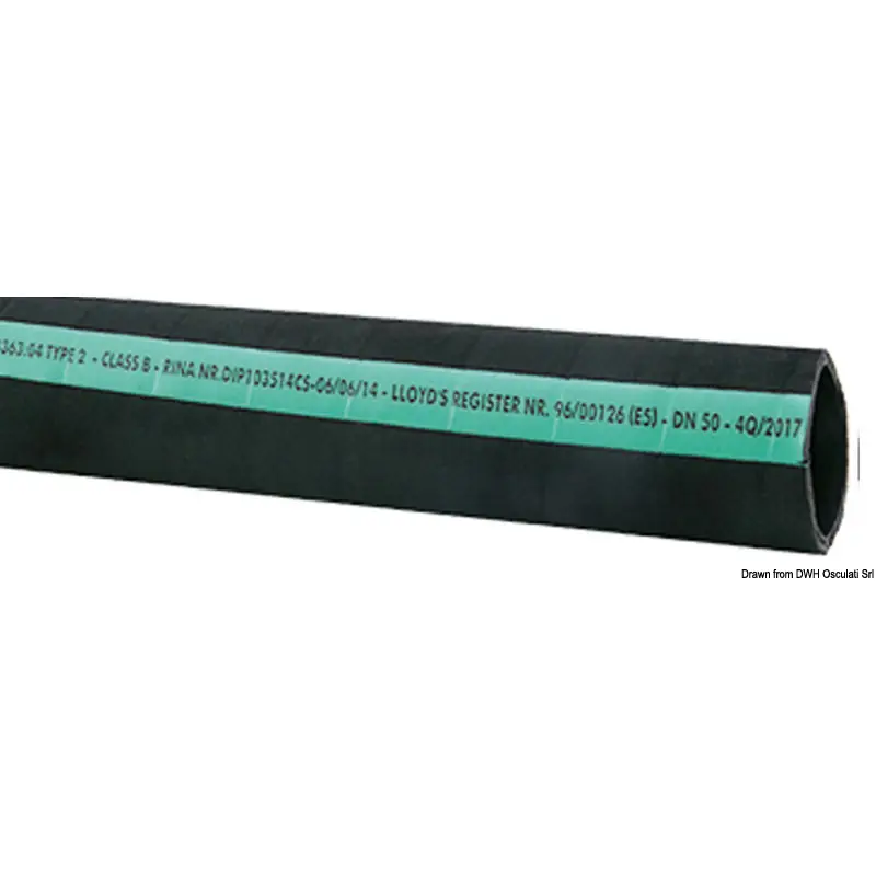 In rubber with RINA + LLOYD certification. The hoses are packaged with a layer of smooth black rubber, high-strength synthetic fabrics, and an integrated steel spiral.Cover in black flame-retardant rubber, resistant to contact with petroleum products, seawater, atmospheric agents, and abrasion.
