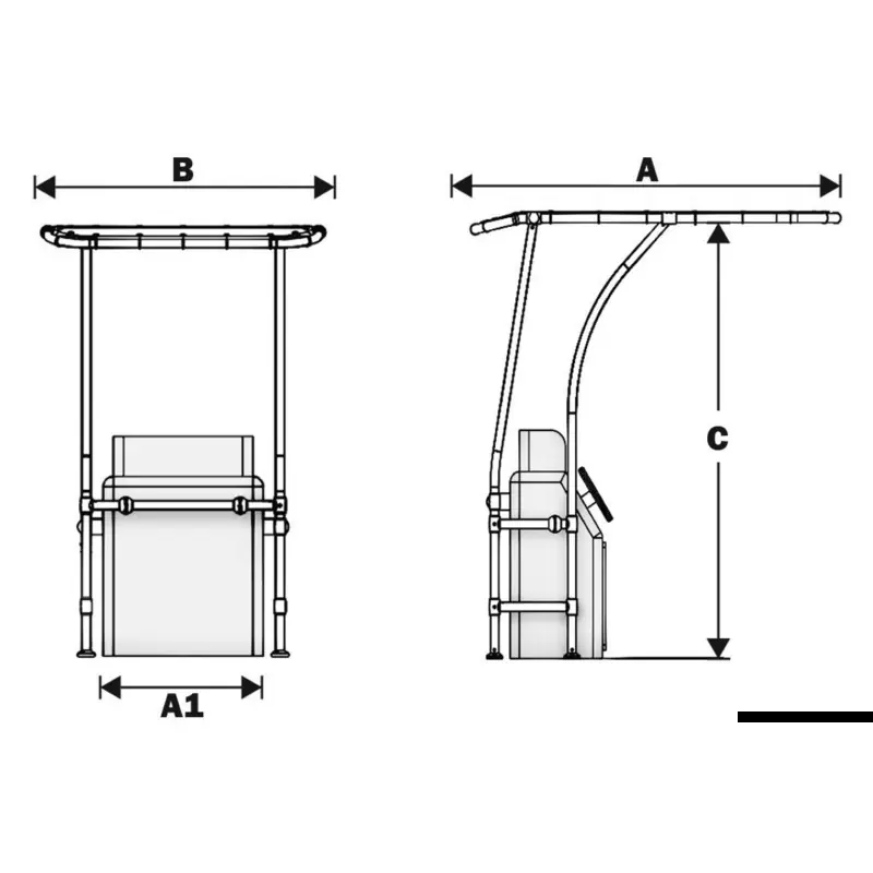 Manufactured from Ø 44 mm tube, with high-strength resin fittings and very high-quality welded parts. Universal as the connections to the console can be adjusted as desired. The fabric of the T-Top is blue ATLAS polyester 340 g/m waterproof and UV resistant.Max. allowable speed when T-top is installed: 25 knots.