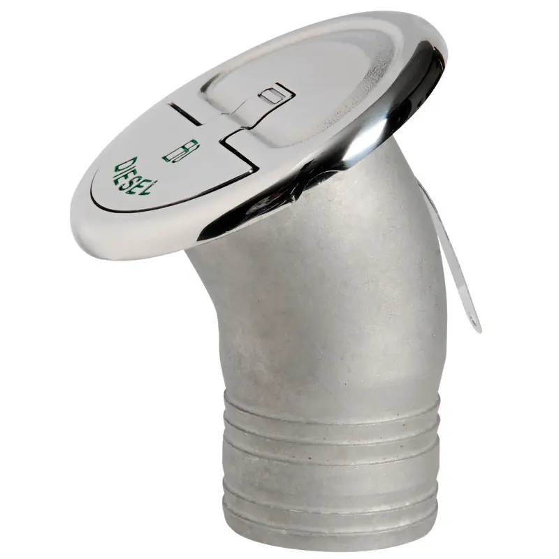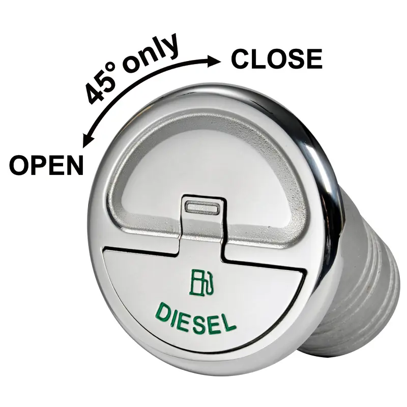 Technical characteristics: 45° rotation snap lock, 7.7-mm projection, hidden screws, stainless steel check cable with spring, fuel and diesel versions with earthing cable, made of mirror-polished AISI 316 stainless steel, DIN standard symbols.