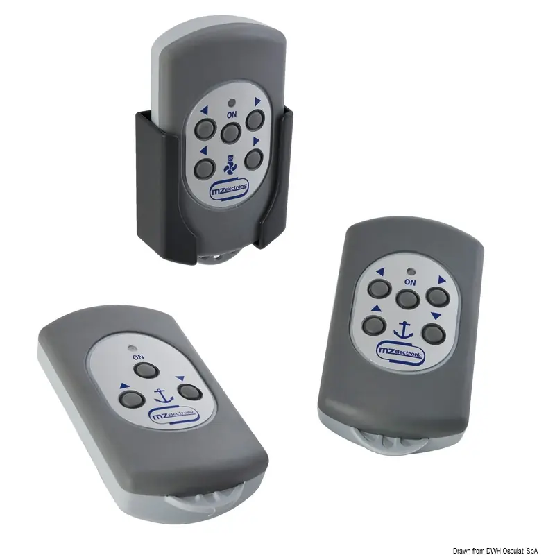 The kit includes a radio control and a control unit (pre-combined), the system can support up to 8 different commands (sold separately). Two models with 3 and 5 buttons can be easily connected to existing anchor winches and bow thrusters. They are equipped with 2 replaceable AAA batteries and are floating and waterproof up to a depth of 1 meter (IP66). Average range 40 m. Version A) - allows remote wireless operation (Up / Down) of any anchor winch provided it is operated by a solenoid; - includes a control and a receiver. Version B) - allows wireless operation of any bow thruster (port and starboard thrust) and any anchor winch operated by a solenoid (Up / Down); - includes a remote control, a control unit for anchor winches and bow thrusters.