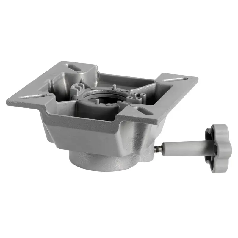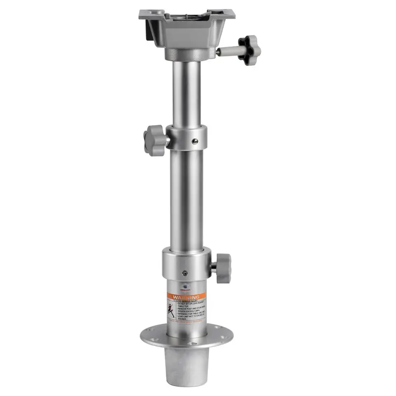 Adjustable height table pedestal made of durable anodized aluminum for versatile marine use.