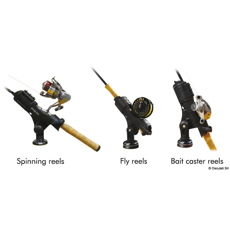 Robust and highly adjustable to ensure the rod is safe in almost all positions.• For spinning reels, bait casters, boat reels, and fly reels;• The rotating collar helps reduce 'sudden jerks';• End pin to reduce the rod rotation; lift to let the poles slide;• Swivelling at 360° and 90° in vertical.