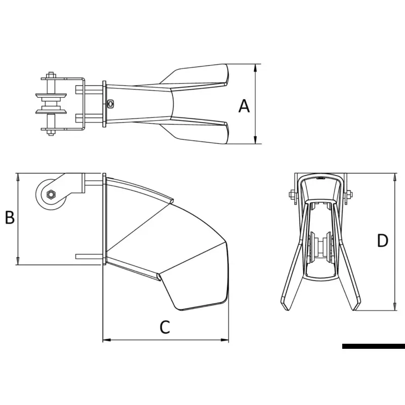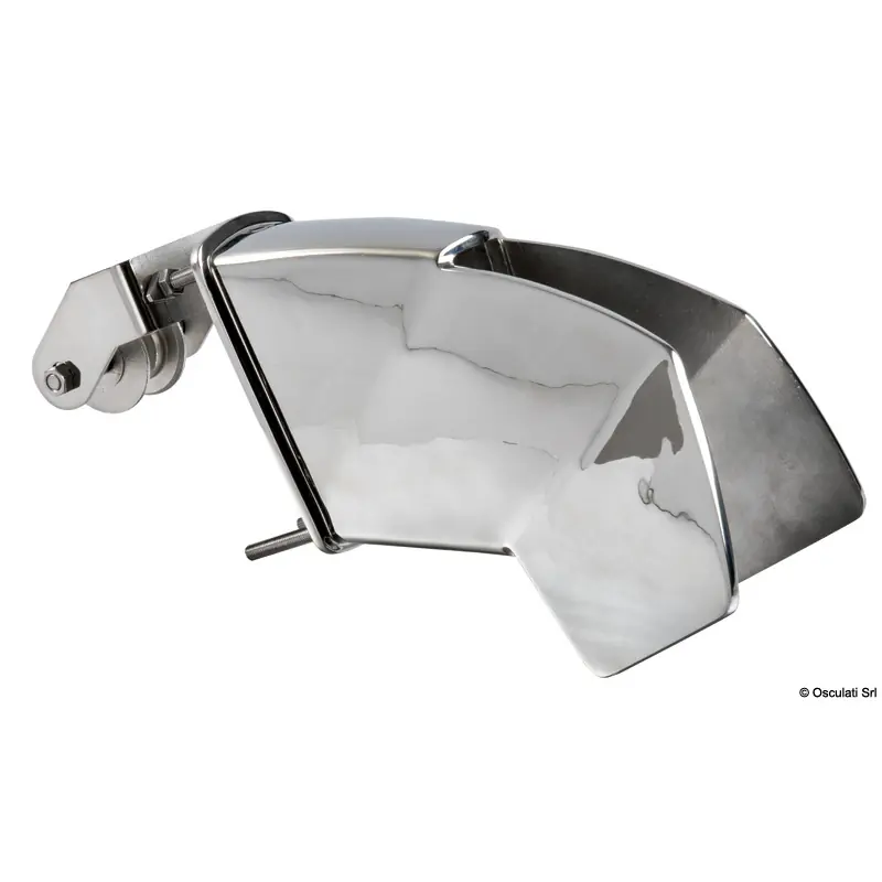Bow roller for anchor with coupling plate for perfect closure of the hull hole. This system makes the plate strike against the roller preventing water from leaking into the forepeak. The roller is designed to match the Trefoil anchor for a combination of high-level products in style and performance. The system can be easily installed by 4 studs behind the roller and is fitted with two sheaves for smooth sliding of the chain. Entirely made of mirror-polished AISI 316 stainless steel. It is recommended to install it on the chain by means of the Twist joint 01.738.01. Windlass ideal pull angle at 5° / 20° from the roller horizontal axis.
