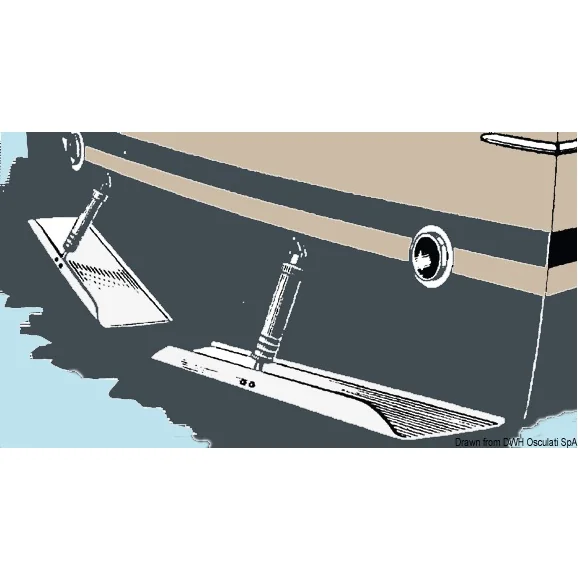 Made of stainless steel, model fitted with 2.5 mm thickness and special swivelling hinge; the tab can rotate 180° without forcing or breaking the transom bracket. Designed to be mounted: with electro-hydraulic kit Bennett 51.235.12/24; with electro-mechanic kit EM 52.350.00 (only standard series 51.134.01/02/03/04/05); with mechanic kit 51.134.00 (standard series 51.134.01/2/3/4 only).