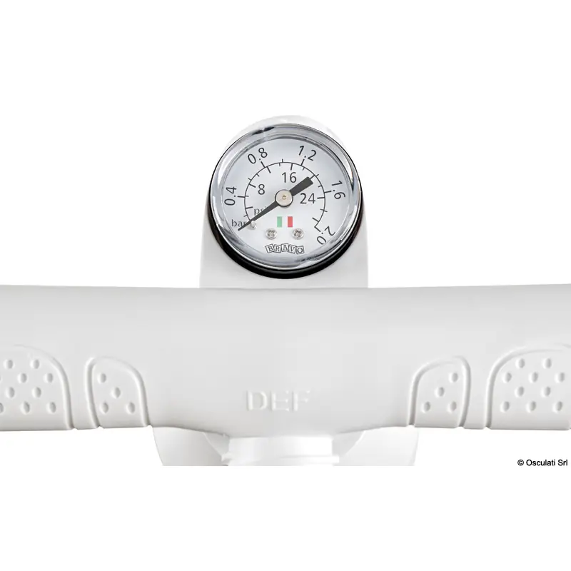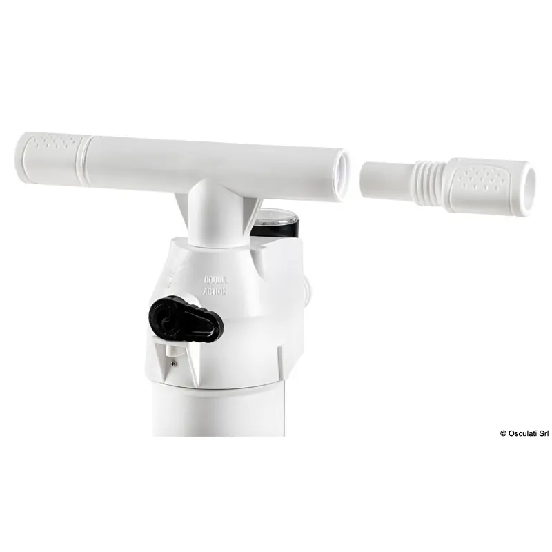 The aluminium inflation tube is positioned outside the body ensuring greater efficiency and less effort.The position of the pressure gauge on the cover (not on the handle) facilitates air pressure reading.The foldable base and detachable handles allow for space-saving packaging.