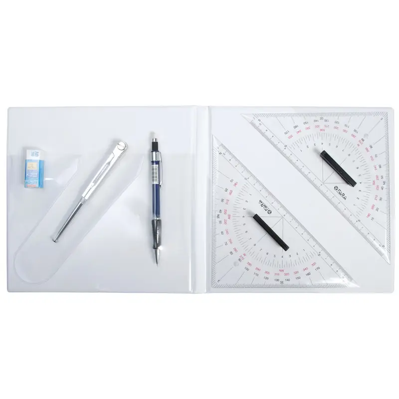 Cheap version. It includes 2 square sets, dividers, Graphos pencil + eraser in elegant case.