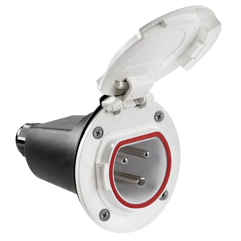 Nautical socket and plug for 32A - 220V shore power cable. Made of PA6, equipped with high energy efficiency contacts and an IP67 closure cap. The plug is designed to ensure an ergonomic grip, and the rotating ring allows it to be securely fastened to the boat's socket with an IP67 watertight seal, while the rubber cap ensures an IP44 seal when not connected. The clean design and compact dimensions allow for convenient installation of the socket anywhere in the cockpit. Compliant with European safety standards IEC 60309-5.