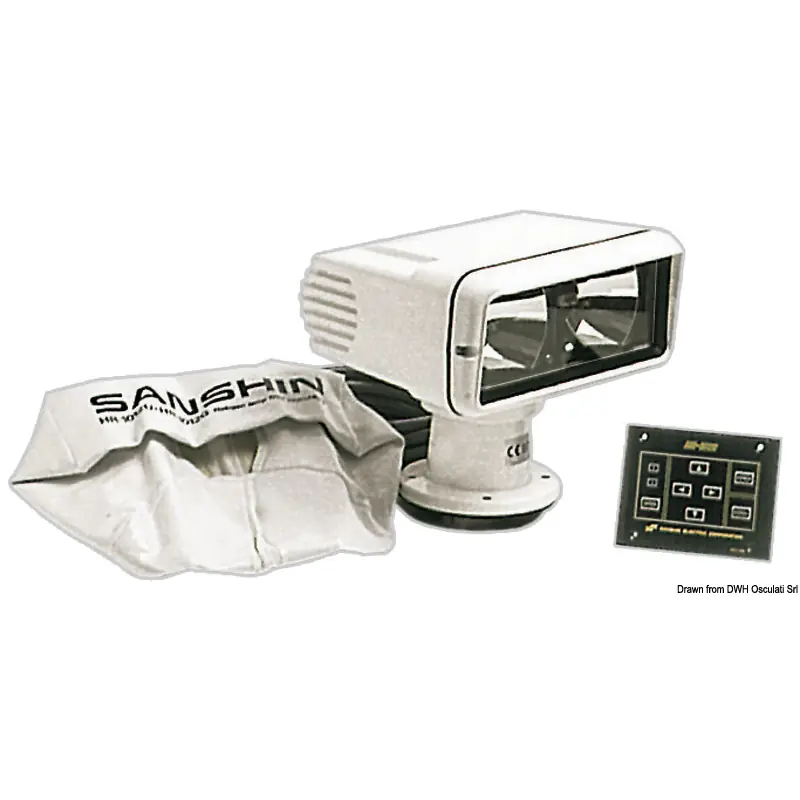 Fitted with two 55W halogen bulbs. Light alloy] white body, remote control, clamp flasher and lantern variable rotation speed. Max capacity 1200m, dimensions 200x232mm.