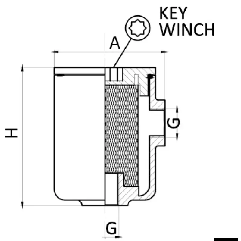 Cup model with a side mouth and one at the bottom. In nickel-plated brass with internal filter element in stainless steel and transparent screw lid in polycarbonate. Rotating support band in stainless steel. The octagonal "winch" key for easy opening of the lid is included.