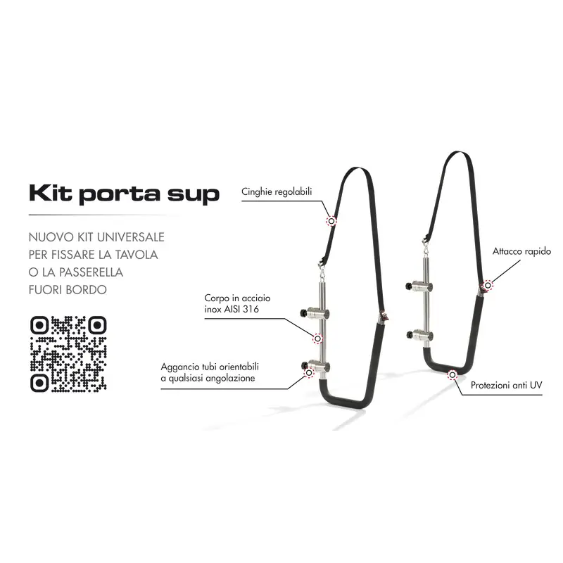 This kit is used to fasten the SUP board or the gangplank out of board.To be mounted to the railing by means of 360° adjustable stainless steel clamps. The quick-release knob system allows each arm to be rotated immediately when not in use or rotated at a tighter angle to better fit SUPs or narrower gangways.Each arm features a high-intensity foamed PVC protection that shields the SUP or gangway from abrasions and has adjustable and easily removable straps. Standard version: for 22- to 30-mm diameter tubes with plastic accessories.Deluxe version: for 20- to 28-mm diameter tubes with AISI316 stainless steel accessories.