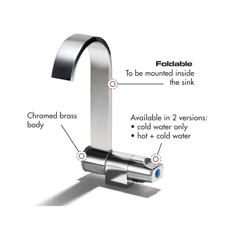 Made of chromed brass. It can be mounted inside the sink for a flat design countertop.