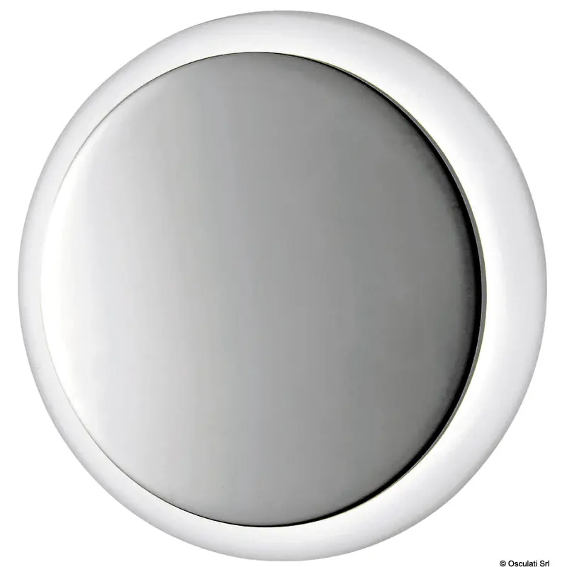 White plastic body, mirror-polished stainless steel front panel. Snap mounting.