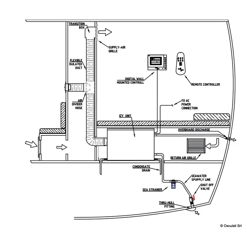 IZY is the exclusive product designed for DIY installation of air conditioning system in any boats by people without technical background.The durable and room-saving 316 stainless steel casing internally insulated for noise emission reduction contains:- a high-efficiency compressor;- a corrosion-resistant copper-nickel heat exchanger;- a refrigerant gas-air heat exchane coil;- a seawater circulation pump;- all electrical and electronic components.The heating mode is activated through an electric resistance, unlike heat pump systems.With cycle reversal. The air conditioner efficiency is not affected by the decreasing of sea water temperature in winter, thus achieving 100% of the available thermal power even with water temperatures below 10°C.Power supply 220V.* Air distribution kit and seawater recirculation OPTIONAL to be ordered separately code 50.268.00 / 50.267.99