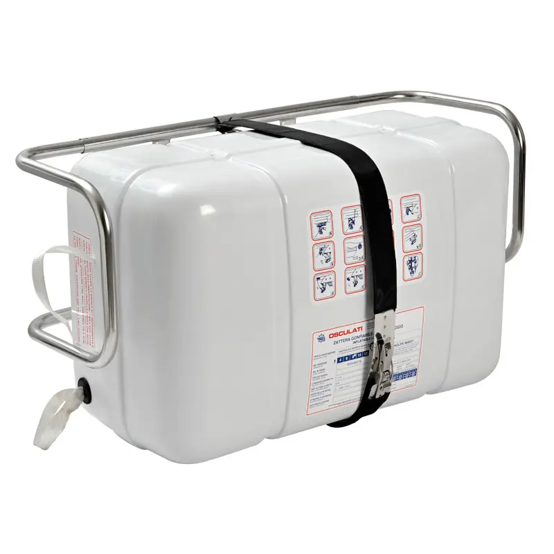 (4 pcs). Raft fastening by means of a sturdy nylon-coated stainless steel strap + cam hook and padlock ring. Fast launching by opening the cam hook. Mirror-polished AISI 316 stainless steel frame.