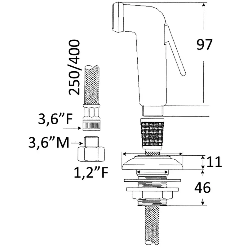 Plastic and chromed brass lever-operated shower head. The water system opens and activates the fresh water pump by pushing the button. It prevents using an intermediate locking faucet. Designed for deck mounting.