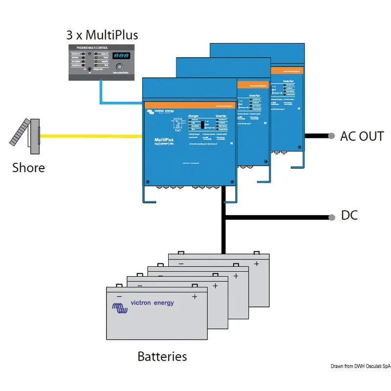 This system combines a pure sine wave inverter and a sophisticated battery charger using adjustable recharge technology. Compatible with lithium batteries.Two AC outlets. In case of power shortage from the dock or from the generator, the system continuously feeds what's connected.The second outlet is available in case of AC source, only. The devices, such as boilers, which might run the battery down should be connected to this outlet.Parallel + three-phase function. Up to 6 units can be connected in parallel. For the three-phase current, 3 units of the same kind can be connected. Up to 6 series of 3 units each can be connected in parallel.Power control: the very powerful multiplus device can absorb a lot of power from the dock or the generator. By means of the multicontrol panel (14.270.32), the current draw can be monitored and a maximum limit can be set. Depending on the limit set, the multiplus device will only use the remaining energy to charge the batteries.Power assist: whenever a power peak is required for a short period, the multiplus device will offset the power shortage drawing energy from the battery. When the current draw drops, the surplus current is used to recharge the batteries.The micro-processor operated battery charger is fitted with a 4-stage bulk-absorption-float-storage charge system similar to the Phoenix/Skylla battery chargers.- Aluminium body- Protection devices against short circuit, overcharge, too low or too high battery, high ripple frequency, etc.