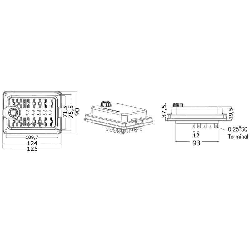 Semi built-in box with rubber seal, housings for 10 blade fuses, rear outlet, 6 spare fuses, LED light for burnt out fuses.