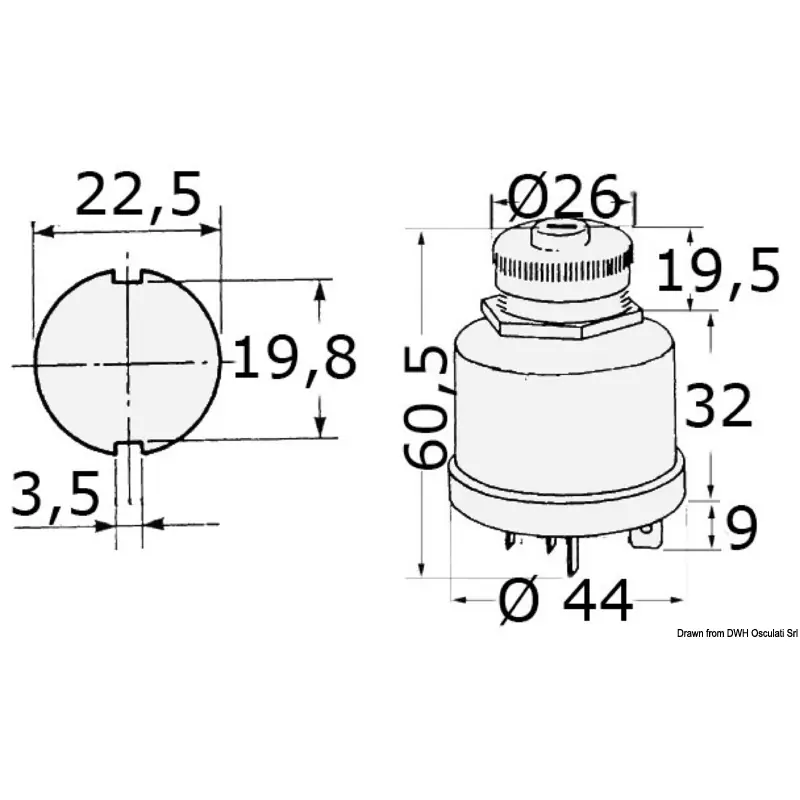 Fitted with removable key, which activates selected systems such as the bilge pump, water level or petrol level without powering the whole boat. Watertight seal by means of a cap on the key hole. The additional function cannot be activated by error as the key must be turned to the left and pushed in. Universal model for petrol or diesel engines, fitted with nylon body, stainless steel, nylon and rubber cap.