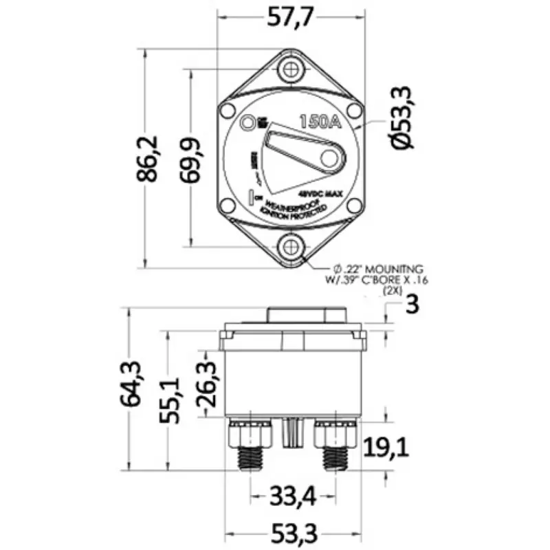 Resettable and releasable via a specific lever, they simultaneously serve as both fuse and switch. Manufactured in accordance with USA standards SAEJ1171 and CE 28846 “Vapor Proof”, capacity 3000 operating cycles. Allowed voltage: max 48 V,Enlarged version, electrical terminals at 5/16” (instead of 1/4”) to facilitate cable connection. The recessed model requires a simple circular hole for installation. IP66 Waterproof. From 100 A to 200 A can also be used as a general battery disconnect.Maximum voltage capacity:5000A 14VDC;3000A 28VDC;1500A 48VDC.Operating temperature: -40C° / 85C°.