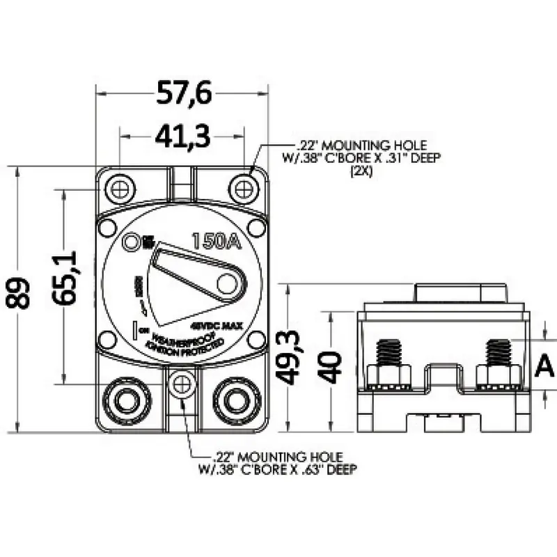 Resettable and releasable via a specific lever, they simultaneously serve as both fuse and switch. Manufactured in accordance with USA standards SAEJ1171 and CE 28846 “Vapor Proof”, capacity 3000 operating cycles. Allowed voltage: max 48 V,Enlarged version, electrical terminals at 5/16” (instead of 1/4”) to facilitate cable connection. The recessed model requires a simple circular hole for installation. IP66 Waterproof. From 100 A to 200 A can also be used as a general battery disconnect.Maximum voltage capacity:5000A 14VDC;3000A 28VDC;1500A 48VDC.Operating temperature: -40C° / 85C°.