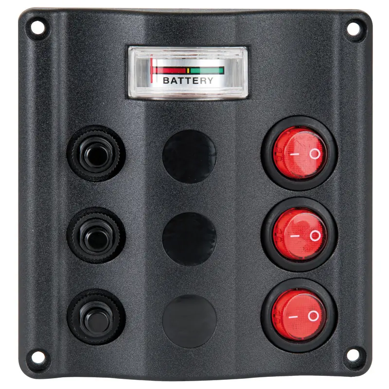 Efficient electric control panel with 3 switches and a 12V voltmeter for reliable marine use.