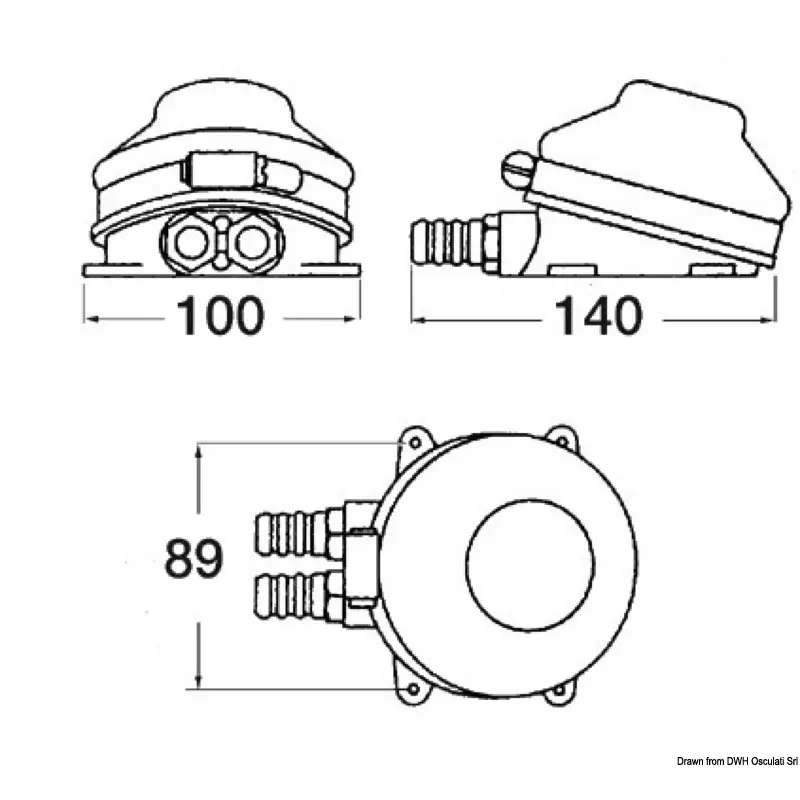 Self-priming foot-operated pump designed for easy installation and use. Ideal for a simple fresh water system. Angled upper section. Compact size for installation in confined spaces.