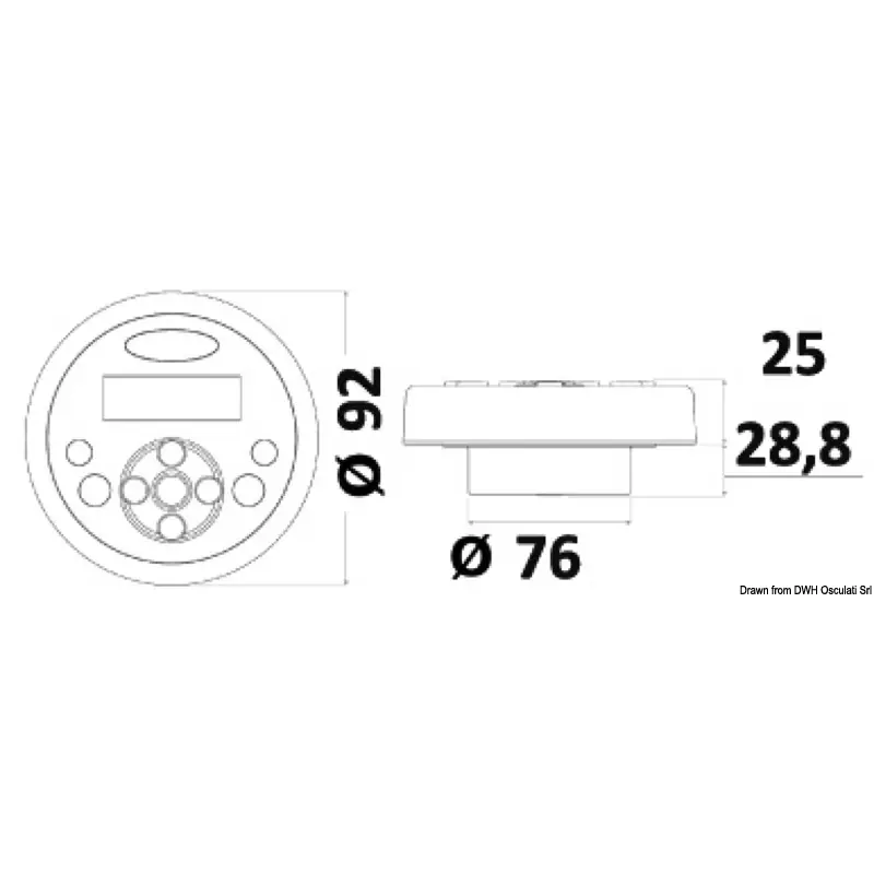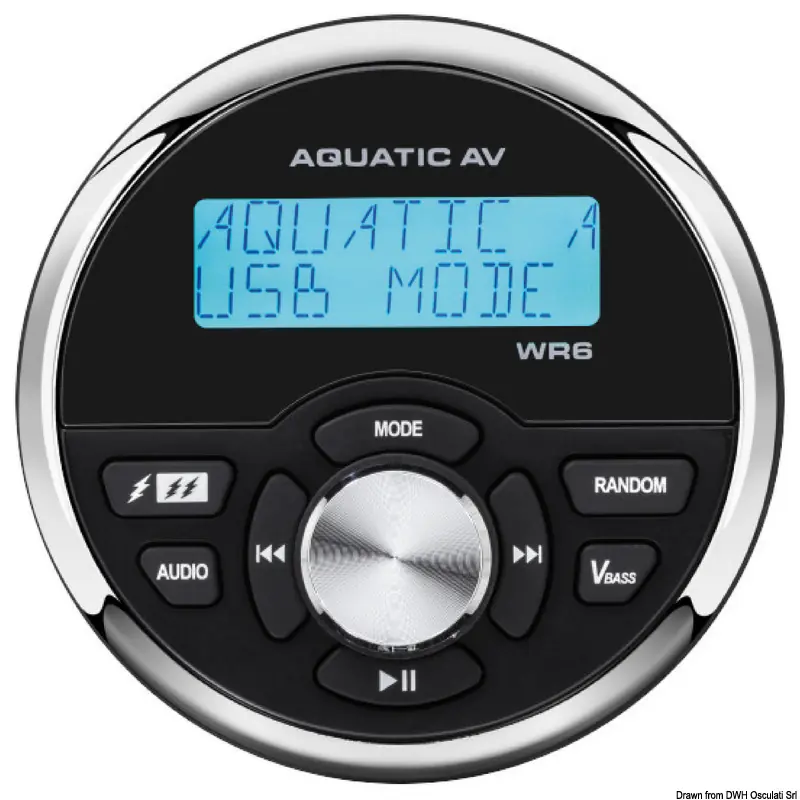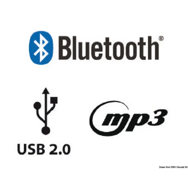 - Supported Media: Bluetooth/USB/MP3/AM/FM/DAB (with adapter 29.548.83)/AUX (with rear USB connector).- Display: TFT screen.- Inputs: Bluetooth, 1xUSB, 1 pair of RCA.- Outputs: 1 pair of 2V RCA pre-out.- AM/FM Tuner: 18xFM and 12xAM pre-set memories, US/Euro frequencies.- Power (max): 4x45W (4 Ohms), 4x72W (2 Ohms).- Output voltage: 10.5 V – 14.4 VDC.- IP65 waterproof.- Accessories: clock (included).- Additional features: stainless light alloy, silicone dashboard cover, 2 x external triggers (12V, 3A) for connection to amplifiers.