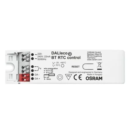 The Osram DALIeco BT RTC / Control units for light management systems. Daytime depending change of brightness and colour temperature (HCL). It is suitable for Human Centric Lighting Applications (HCL). It control the light via Smartphone and adjustment of all settings via smartphoneCompact light control with DALI interface Smart phone connection via Bluetooth to control and configure Integrated clock for time based control of brightness and colour temperature (HCL) Adaptable HCL curve with up to 24 points One DALI output channel (Br