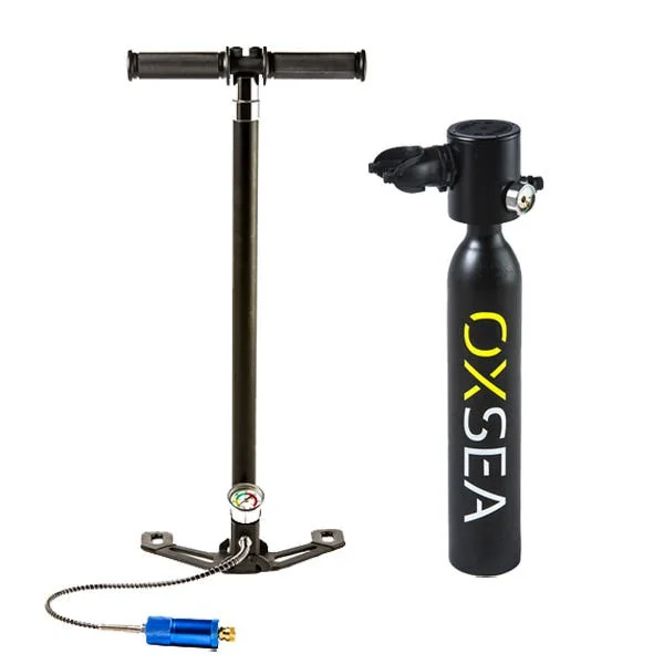 The OX500 Mini Bottle Pack with Manual Pump is designed for underwater enthusiasts seeking a lightweight and portable solution for short aquatic excursions or recreational pool use. This ready-to-use pack includes a 500 ml OX500 mini bottle and a manual pump, providing up to 8 minutes of underwater autonomy from 0 to -3 meters depth.