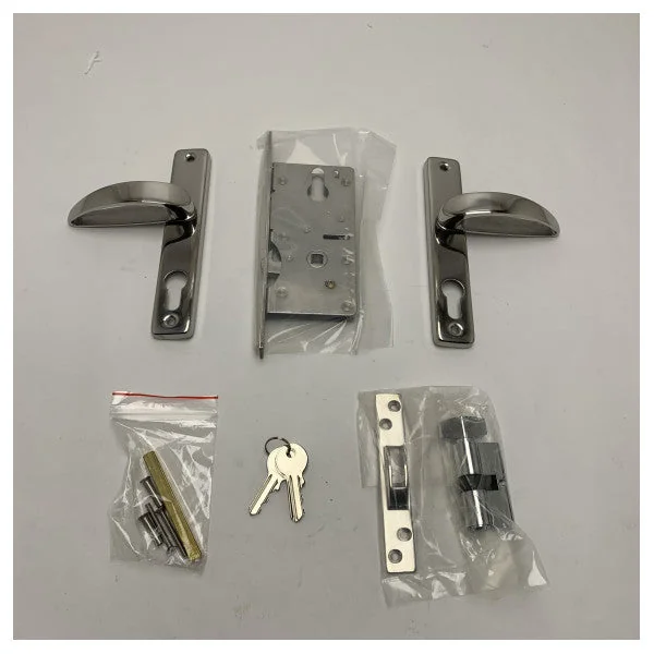 - Includes: two door handles, lock, strike plate, cylinder lock, and three keys