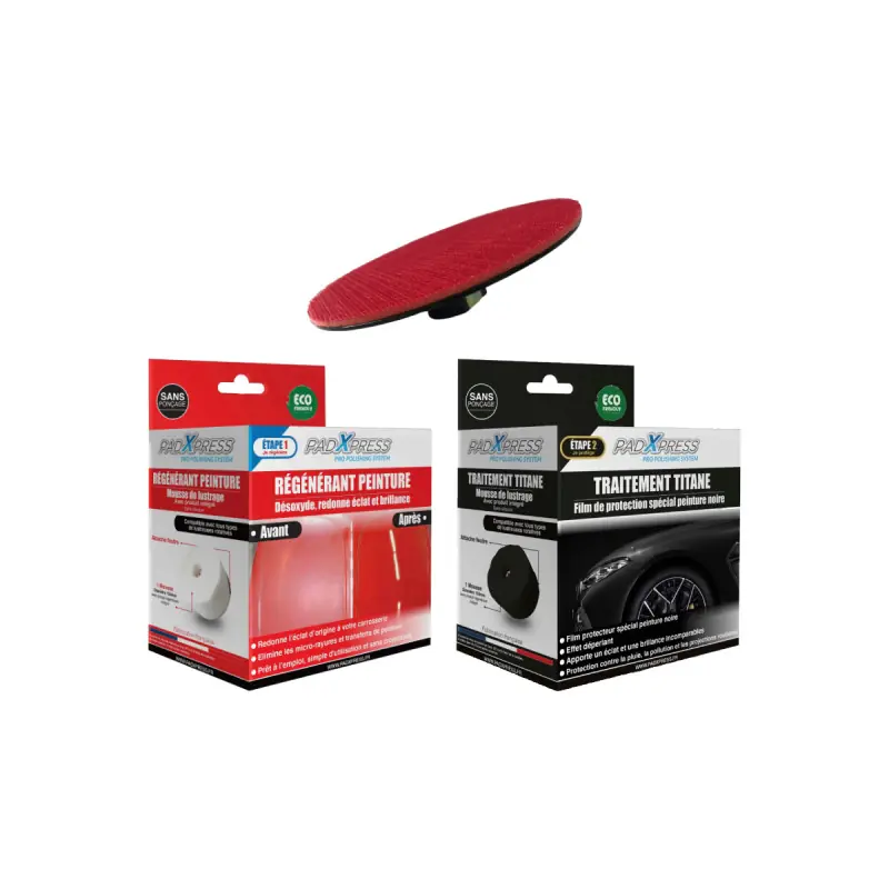 ThisPadXpress Auto pack includes 2 complementary products for a flawless bodywork. It contains ahigh-performance paint revitaliser with a deoxidising and non-abrasive formula that brings your bodywork back to life by removing the micro-scratches present. It also includes atitanium treatment for black paint that protects the paint with its water-repellent, anti-adhesive properties and resistance to impacts and micro-scratches. This product adds up to 30% more shine and leaves a protective film for long-lasting action. Make your bodywork shine in just 30 minutes, which is enough time to apply the treatment. Designed for home or professional use, easily apply the products equipped with a patented device: a foam with an integrated reservoir that attaches to the plate of your polisher. A125 mm adapter plate is included in the pack.