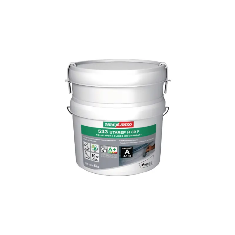 The fluid epoxy adhesive PAREXLANKO 533 Utarep H 80 F ready to bond this product will allow you to create bonds on various surfaces. This solvent-free two-component fluid epoxy adhesive complies with two standards: NF EN 1504-4 and NF EN 1504-3. For example, since it can be used as an adhesive to repair concrete structures or to reinforce them with mortar or bonded concrete (hardened concrete on hardened concrete), it falls under the NF EN 1504-4 standard.