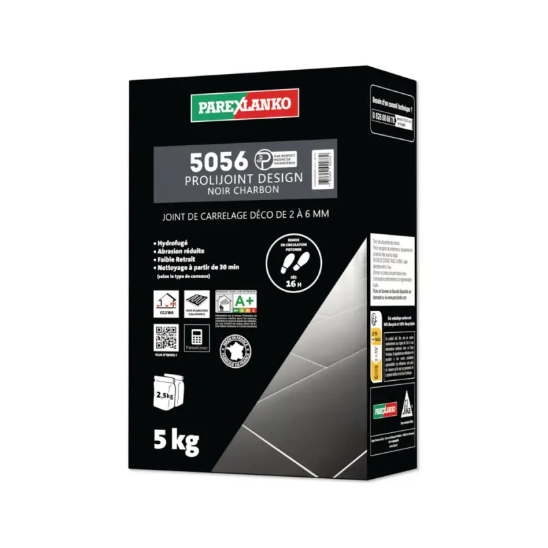 ThePAREXLANKO 5056 Prolijoint Design - Charcoal - 5 kg - L5056CHARBON05 grout is an ideal solution for finishing and enhancing your tile coverings, allowing you to create fine joints of 2 to 6 mm. Designed for easy application, it ensures perfect homogeneity and durable resistance to everyday wear and tear. Its charcoal colour adds a modern and elegant aesthetic touch, ideal for floor and wall tiles both indoors and outdoors. Thanks to its high-performance formulation, this grout is water-repellent, limiting water absorption and reducing the risk of stains or mould. It is suitable for both humid areas such as bathrooms and kitchens, as well as surfaces subjected to frequent foot traffic.