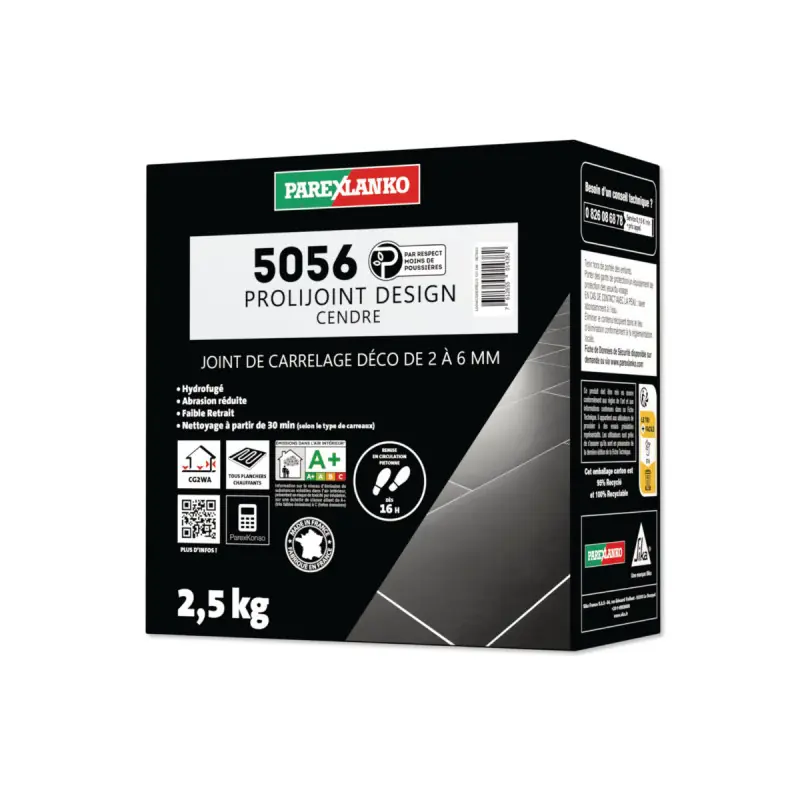 ThePAREXLANKO 5056 Prolijoint Design - Ash - 2.5 kg - L5056CENDRE2.5 joint is an ideal solution for finishing and enhancing your tile coverings, allowing you to create fine joints of 2 to 6 mm. Designed for easy application, it ensures perfect homogeneity and durable resistance to everyday wear and tear. Its beige colour adds a modern and elegant aesthetic touch, ideal for floor and wall tiles both indoors and outdoors. Thanks to its high-performance formulation, this joint is water-repellent, limiting water absorption and reducing the risk of stains or mould. It is suitable for both humid areas such as bathrooms and kitchens, as well as surfaces subjected to frequent traffic.