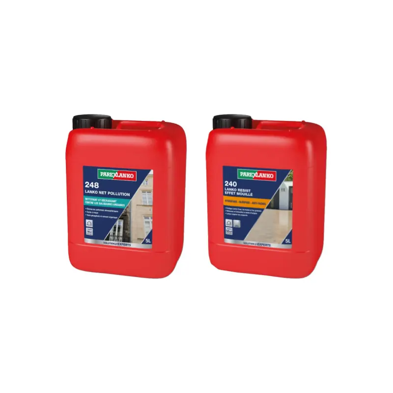 This PAREXLANKO pack includes a liquid cleaner designed to remove combustion residues found on many facades: bricks, stones, concrete... The product is made of alkaline soap. There is also a multi-surface water-repellent product that protects porous or slightly porous surfaces against water, oil, grease, etc. It creates a wet effect. It is important to test the product on a small area before applying it to the entire surface.