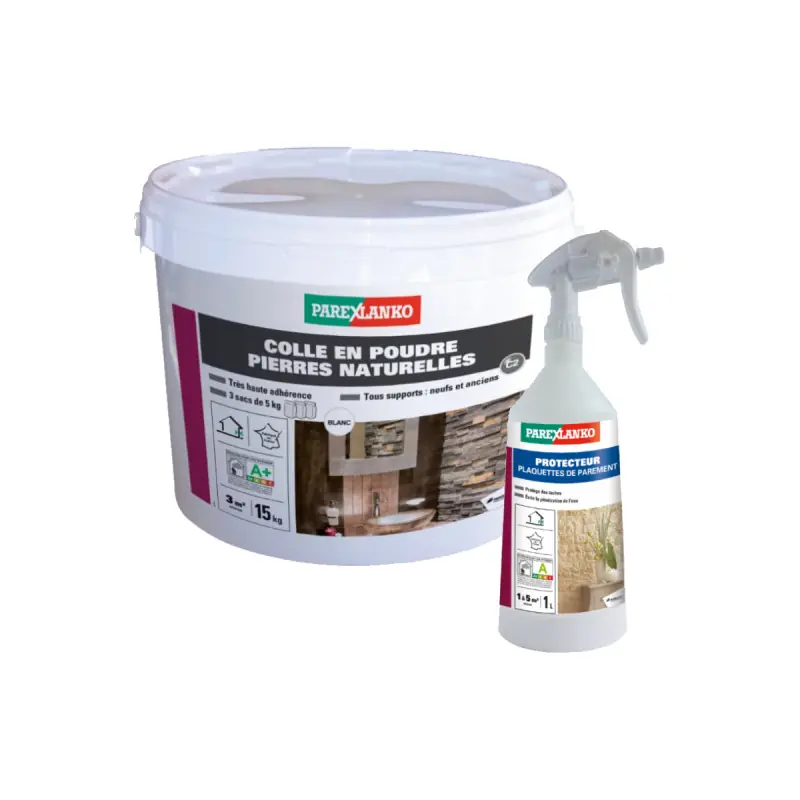 ThisPAREXLANKO packincludes a powder adhesive for natural stone tiles, ideal for work on both exterior and interior walls and floors. Its very high adhesion allows it to bond natural stone cladding tiles and bricks. Your bonding will accommodate sizes up to 50 x 50 cm. A cladding tile protector is included in the pack; it is a surface water repellent in aqueous form based on silanes and siloxanes. Easy to apply on cladding tiles thanks to its spray application. This multi-surface product moves by capillarity and adheres durably to different surfaces. Indeed, thanks to its properties, you can prevent your joints from becoming dirty and protect your cladding tiles and stones from water stains. Furthermore, cleaning will be easier after use.