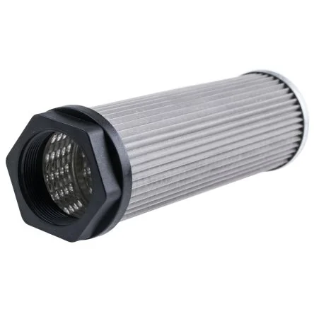 Complete One Piece Suction Strainers. One piece suction strainer for use in hydraulic reservoirs and tanks. These elements can be installed directly onto the pump suction line and should always be below the minimum fluid level of the tank. The end caps, inner support cylinder and filter media are epoxy bonded to form a one piece contrsuction. .