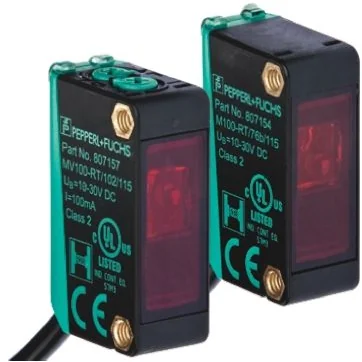 ML100 Series. The ML100 series is characterized by its miniature housing with integral, all-metal threaded bushings. All versions are equipped with a visible red transmitter LED. This greatly simplifies installation and commissioning.,The switching states are easily visible from all directions thanks to the highly visible LEDs. Features and Benefits:. Miniature design Easy to use Clearly visible LEDs for Power ON, switching state and stability control Full metal thread mounting Very bright, well visible light spot Not sensitive to ambient light. Compatible Connectors:. 1240342 1240342 - Pepperl + Fuchs V31-WM-2M-PUR 1240340 1240340 - Pepperl + Fuchs V31-GM-2M-PUR