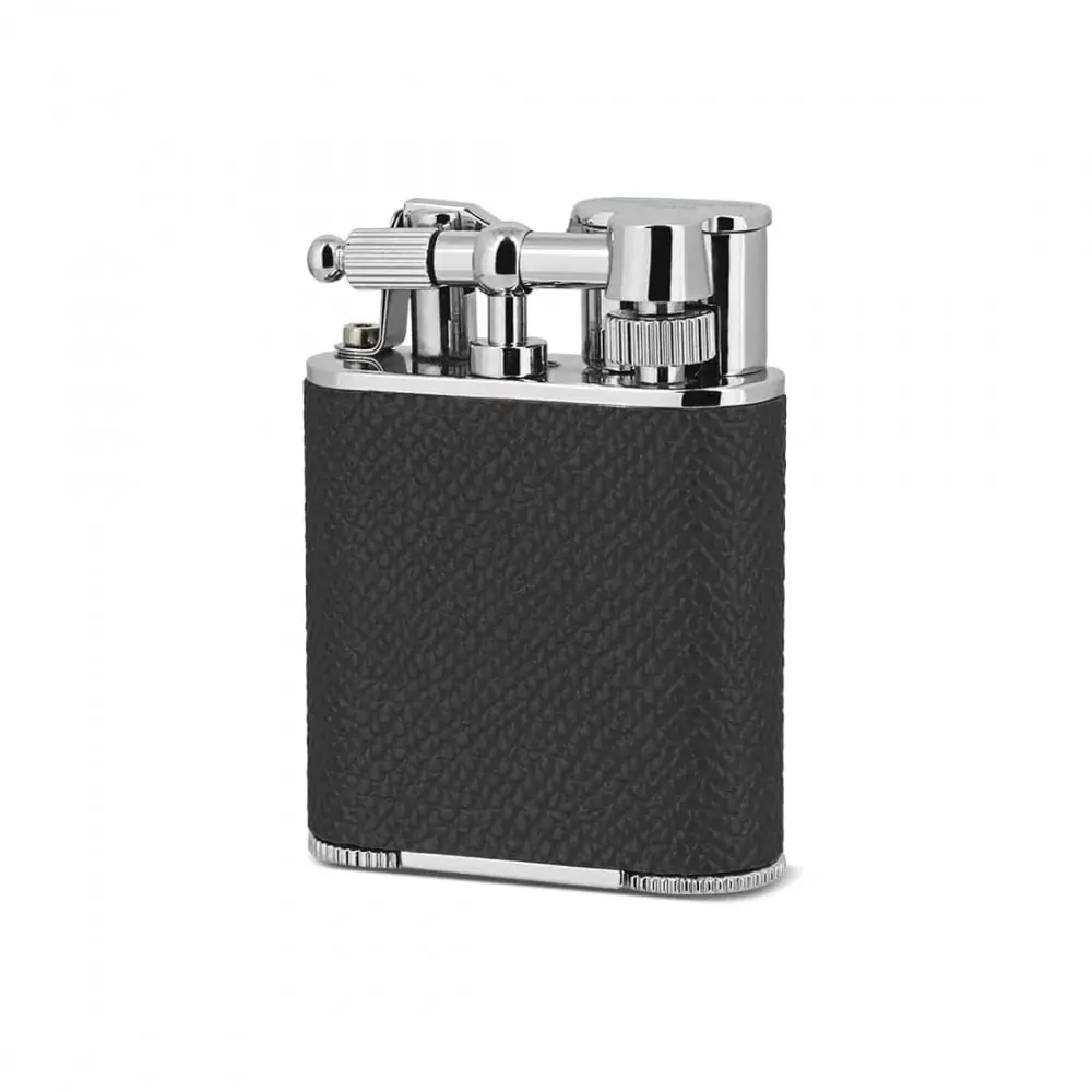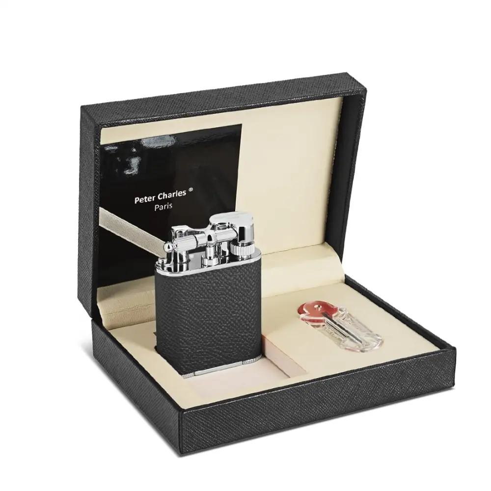 the peter charles junior leather lighter in black is an essential accessory for cigar and refinement lovers. featuring a high-performance double torch flame and elegant leather covering it guarantees quick and precise lighting. its integrated punch located on the base makes it easy to prepare cigars adding a touch of practicality to this chic and compact accessory.