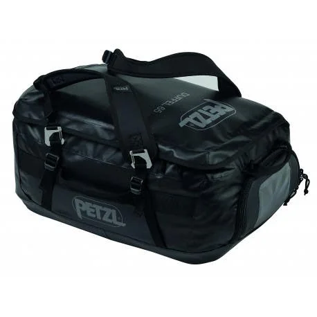 The Petzl DUFFEL 65 Transport Bag is an ergonomic and versatile 65-liter duffel bag designed for efficient gear organization and transportation. Constructed with high-strength, PVC-free TPU tarp material, it offers exceptional durability and resistance to UV exposure, oils, greases, and extreme temperatures. The bag features padded back and shoulder straps for comfortable carrying, with two options: as a backpack or over the shoulder. Four compression straps help optimize volume and secure equipment during transport. A large D-shaped opening provides easy access to gear, complemented by two inner flap pockets (one with a key clip) for organizing documents and personal items. A large side pocket with a zipper closure allows separation of items like helmets or shoes from the main compartment. Additional features include a transparent area for quick identification, four webbing handles for easy handling, eight internal equipment loops, and lockable zippers for added security. The black bottom and sides are welded for enhanced abrasion and tear resistance.