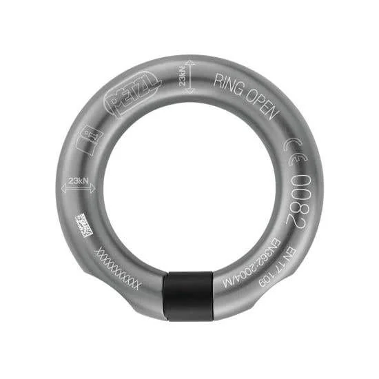 The Petzl RING OPEN Dark Grey is a multidirectional gated ring designed for the semi-permanent connection of equipment. Its round shape ensures optimal functioning in all directions, and the wide opening allows for the installation of ropes with sewn terminations.