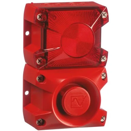 High-efficiency sounder beacon with 100dB output and flashing red light for effective signaling.